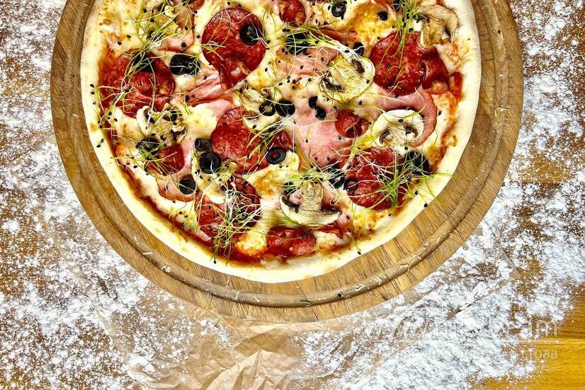 Салямі, бекон, копчені ковбаски, печериці, маслини, сир моцарела, соус зі свіжих томатів на найкращому тісті для піци.