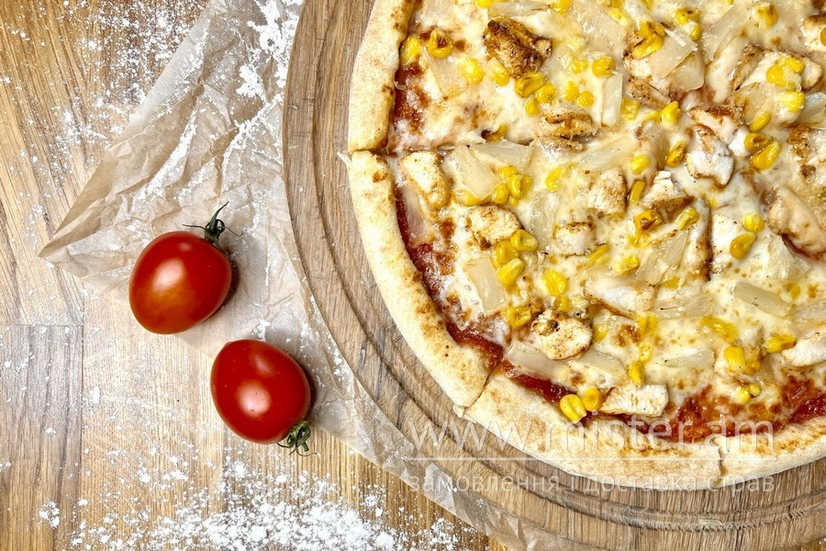 Незвичайне поєднання копченої курочки та солодкуватого ананасу з кукурудзою, ніжна моцарела, червоний соус зі свіжих томатів на найкращому тісті для піци.