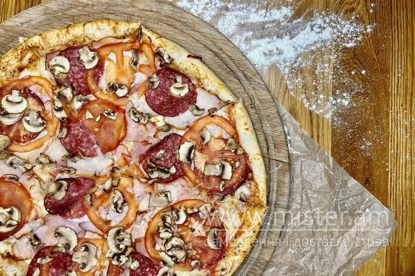 Копчена курка, балик, бекон, салямі, помідор, печериці, червоний соус зі свіжих томатів на найкращому тісті для піци.