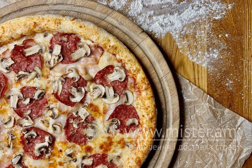Салямі, бекон, печериці, моцарела, червоний соус зі свіжих томатів на найкращому тісті для піци.