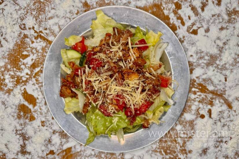 Салат айсберг, томати чері, рвана свинина обсмажена в соусі барбекю сливовий з болгарським перцем, свіжий огірок, пармезан.