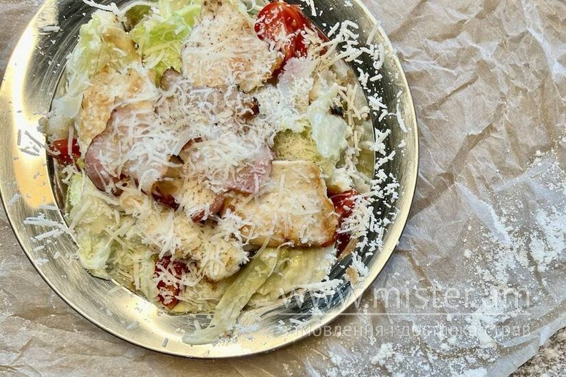 Салат айсберг, смажена курка, бекон, томати чері, соус “цезар”, сир пармезан.