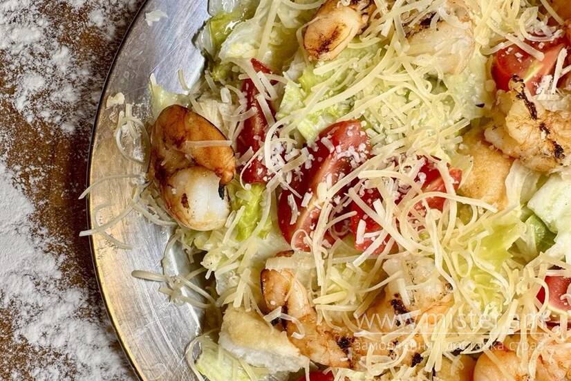 Листя салату айсберг, тигрові креветки, бекон, томати чері, крутони, соус цезар, пармезан.