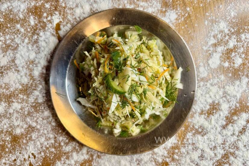 Капуста, яблука, свіжий огірок, морква по-корейськи, сіль, перець, оцет.