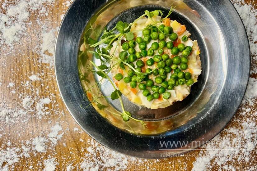 Копчене куряче філе, картопелька, морква, цибуля, солоний огірок, майонез, сіль перець.