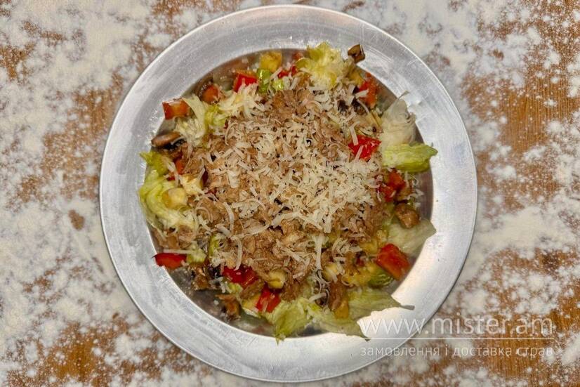 Айсберг, овочі на грилі (цукіні, болгарський перець, печериці), часникова олія, рвана свинина, соус грецький, пармезан.