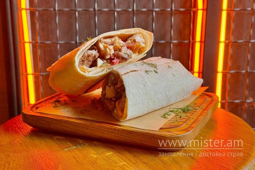 Куряче філе, бекон, яловичий фарш, солоний огірок, маринована цибуля, соус часниковий, соус барбекю, лаваш.