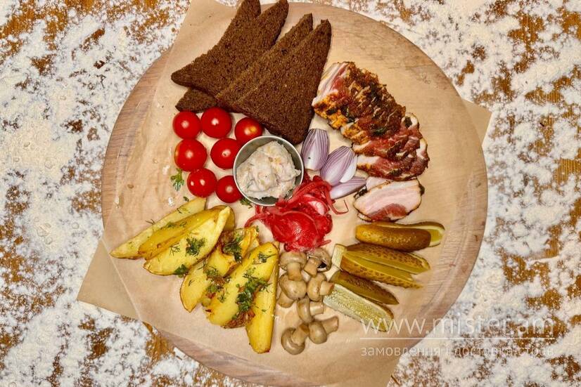 Сало підчеревина мариноване, солоний огірок, мариновані печериці, помідори консервовані, цибуля маринована, хліб бородинський, картопля по-селянськи, сало мелене зі спеціями, червона цибуля.