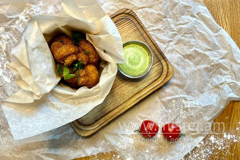Печериці в паніровці обсмажені в фритюрі, посипаються петрушкою, часниковий соус.