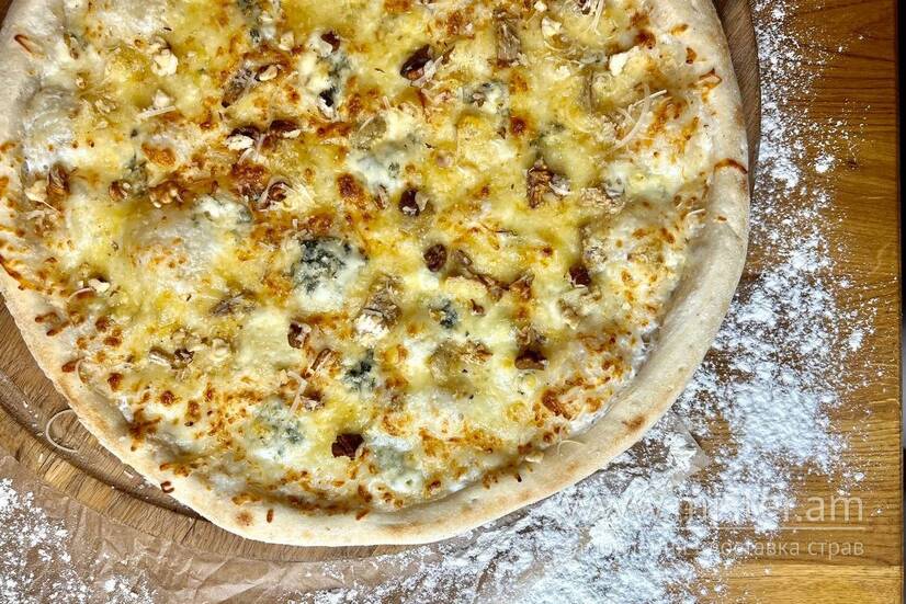 Сир моцарела, сир пармезан, сир дор блю, сир брі, вершки, грецькі горіхи, брусничний соус на найкращому тісті для піци.
