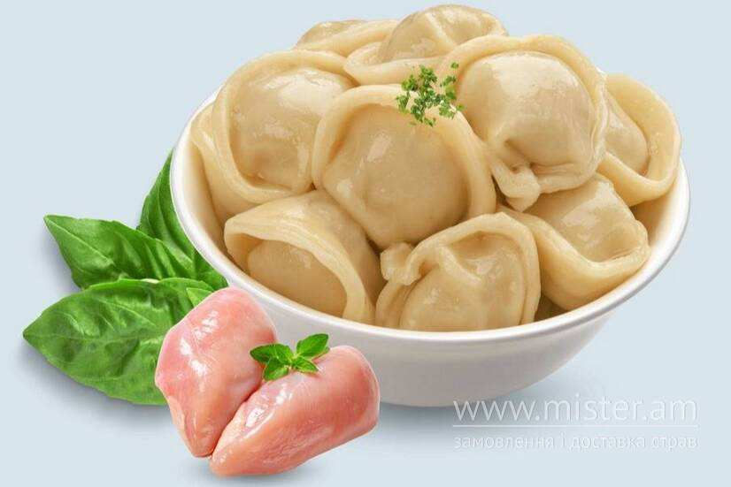 Борошно пшеничне в/г, м'ясо курки, цибуля, часник, кріп, перець чорний мелений, сіль харчова.
