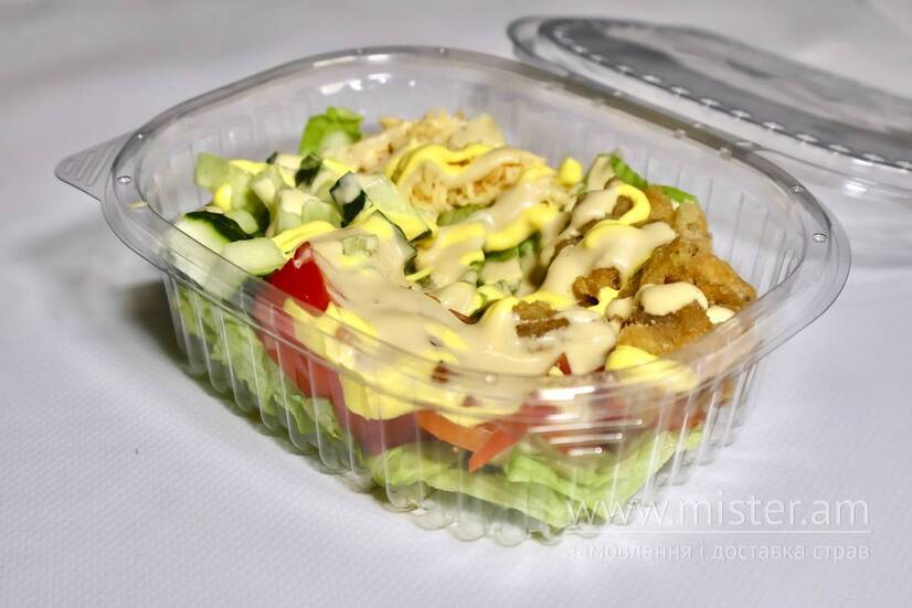 Огірок, помідор, салат айсберг, сир, курочка в хрусткій паніровці, соус сирний.