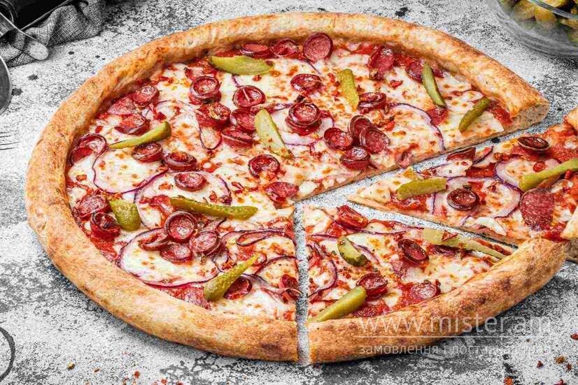 Сир моцарела, мисливські ковбаски, огірки мариновані, цибуля червона, паприка, томатний соус.