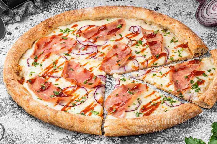 Сир моцарела, шинка, цибуля, соус бешамель, соус BBQ, петрушка.