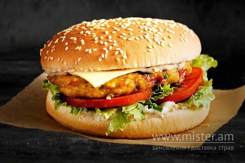 Булочка з кунжутом, два соуси часниковий та бургерний, ніжна куряча котлета, айсберг, маринований огірок, помідор, синя цибуля, чеддер 2 шт..