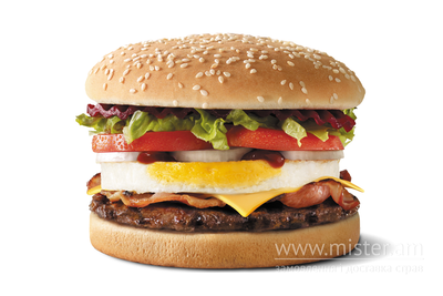 Булочка, котлета з яловичини, сир Чеддер 2 шт., бекон 2 шт., яйце, помідор 2 шт., салат Айзберг, цибуля, соус BBQ та бургерний.