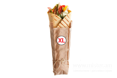 Лаваш, м'ясо на вибір 150 г, капуста, свіжий огірок, солоний огірок, свіжий помідор, соус часниковий.