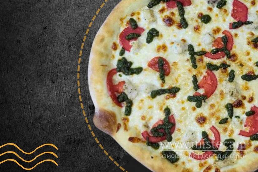 Тісто гречане, куряче філе, помідор, моцарела, соус песто, соус білий.