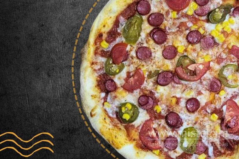 Тісто гречане, ковбаски мисливські, халапеньйо, кукурудза, помідор, моцарела, соус червоний.