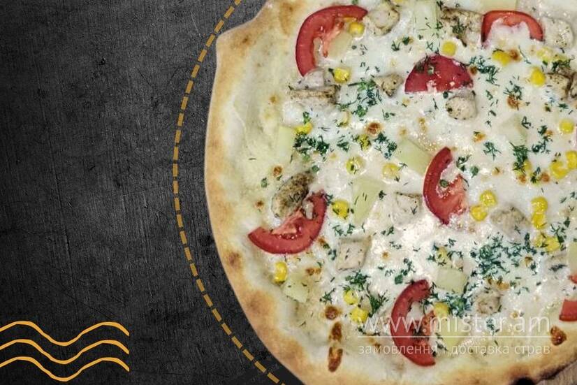 Тісто гречане, ананас, куряче філе, помідор, кукурудза, моцарела, соус білий, зелень.