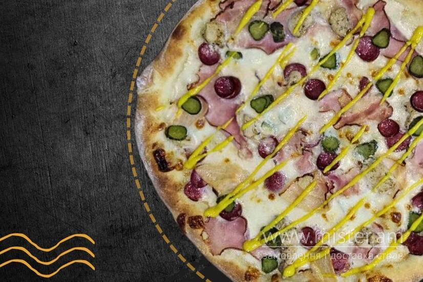 Тісто гречане, шинка, бекон, куряче філе, ковбаски, огірок маринований, гірчиця, моцарела, соус білий.