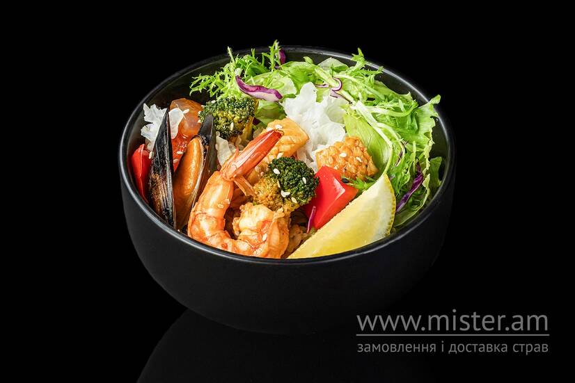 Рис, бульйон курячий, креветки, мідії, кальмари, броколі, перець болгарський, цибуля синя, мікс салату, гриб кораловий, мікс імбир-часник, соус Блек Бін, соус Ланч Кінг, лимон, кунжут.