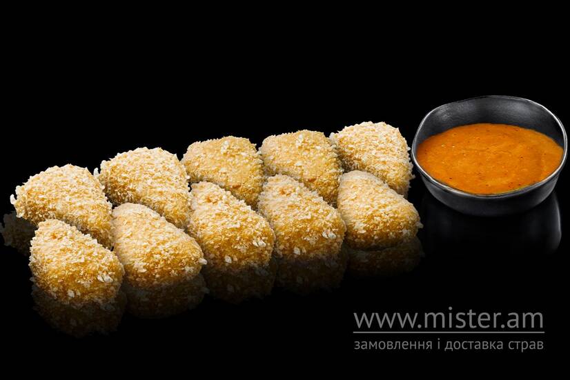 Моцарела, яйце, панірувальні сухарі, борошно темпура, соус горіховий (гострий).