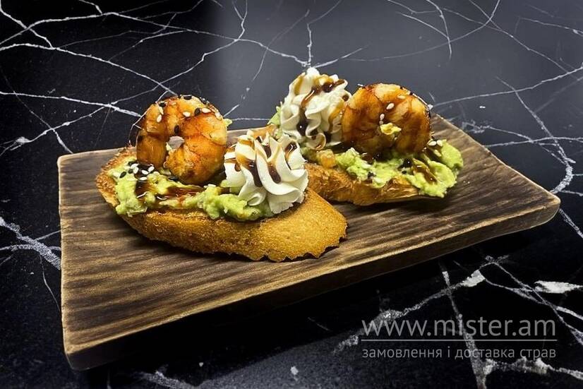 Хрусткий білий багет у поєднанні з ніжним сиром Філадельфія, соковитими тигровими креветками та ароматним песто. Доповнюється вершковим гуакомоле, приготованим з авокадо, лимона, цибулі марс і спецій.