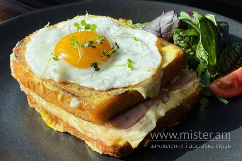 Крок Мадам з шинкою – витончене поєднання ніжної бріоші, соковитої копченої шинки та тягучого сиру гауда.