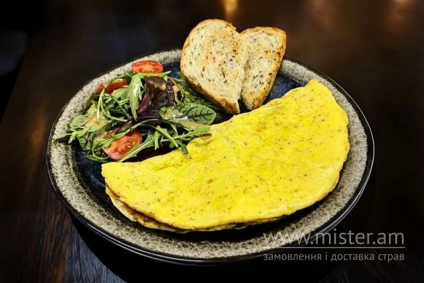 Ніжний повітряний омлет, приготований зі свіжих яєць та вершків, доповнений ароматними спеціями. Подається з хрусткими грінками та легким міксом салату.