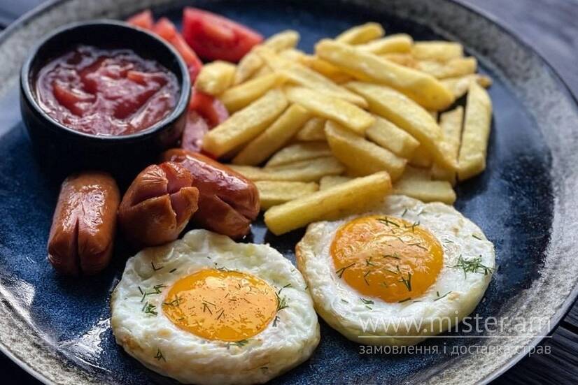 Сніданок дитячий Royal – це ідеальне поєднання улюблених смаків для маленьких гурманів. Ніжні глазуні, підсмажені ковбаски, хрустка картопля фрі, кетчуп та свіжі томати черрі створюють збалансований і поживний початок дня.