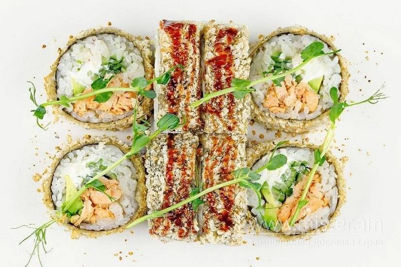 Лосось запечений, сир філадельфія, свіжий огірок, авокадо, рис, норі, кляр темпура, сухарі панко.
