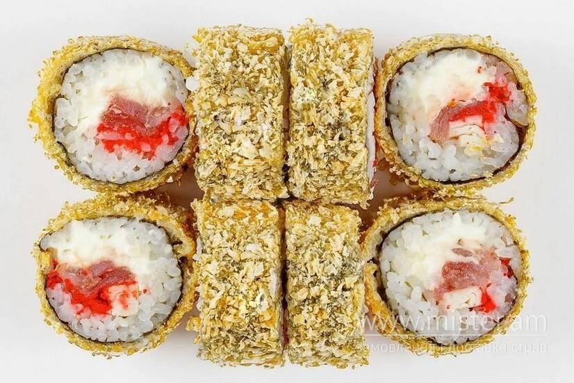 Тунець Yellowfin, сир філадельфія, ікра летючої риби, краб, кляр темпура, сухарі панко.