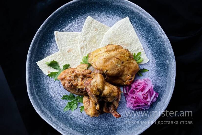 Соковите куряче стегно, замариноване у спеціях та обсмажене в хоспері до золотистої скоринки. Подаємо з маринованою цибулею, тортільєю та соусом аджика.