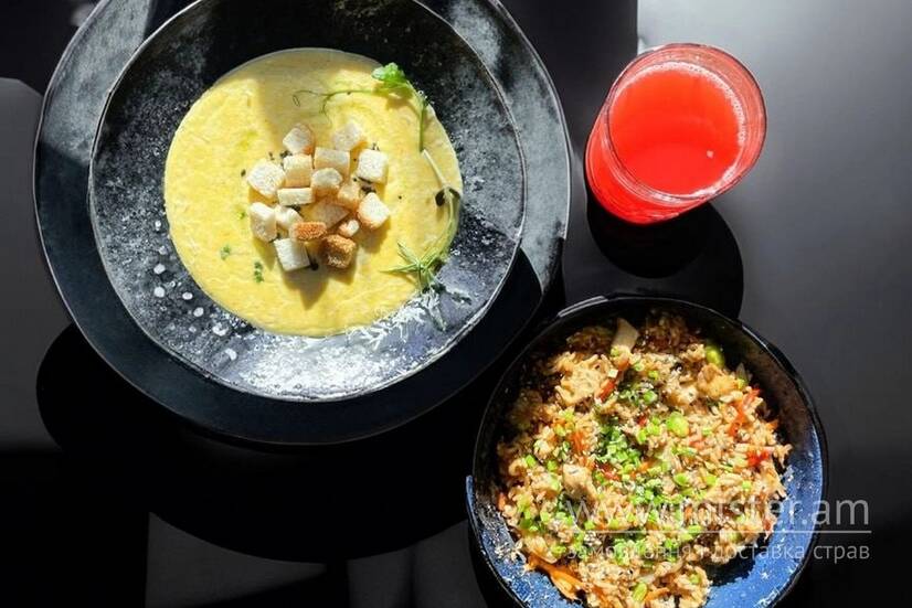 В складі ланчу Eden - Сирний крем суп, Рис в Сичуанському стилі з курочкою, морсік.
