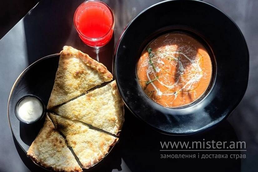 В складі Неаполітанського комбо ланчі - Кальцоне з шинкою та грибами, Zuppa di Pomodoro - Томатний суп, морсік.