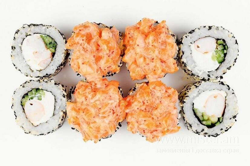 Лосось в соусі спайсі, тигрові креветки, свіжий огірок, ікра летючої риби, кунжут, рис, норі.
