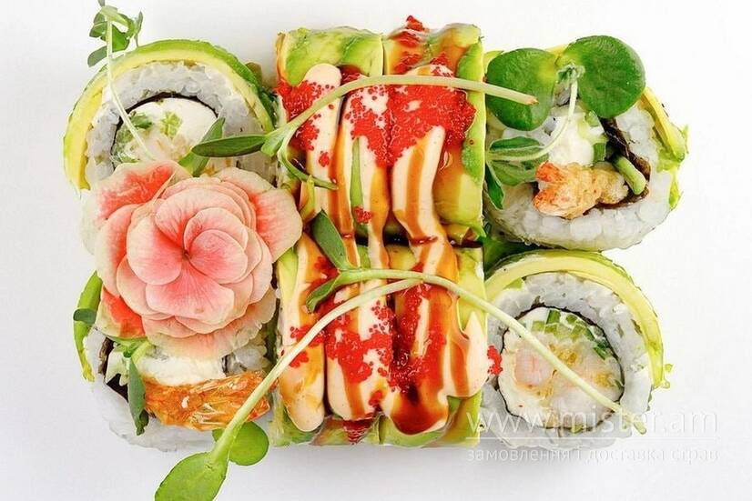 Авокадо ХААС, тигрові креветки Темпура, сир філадельфія, ікра летючої риби, свіжий огірок, соус унагі, соус спайсі.