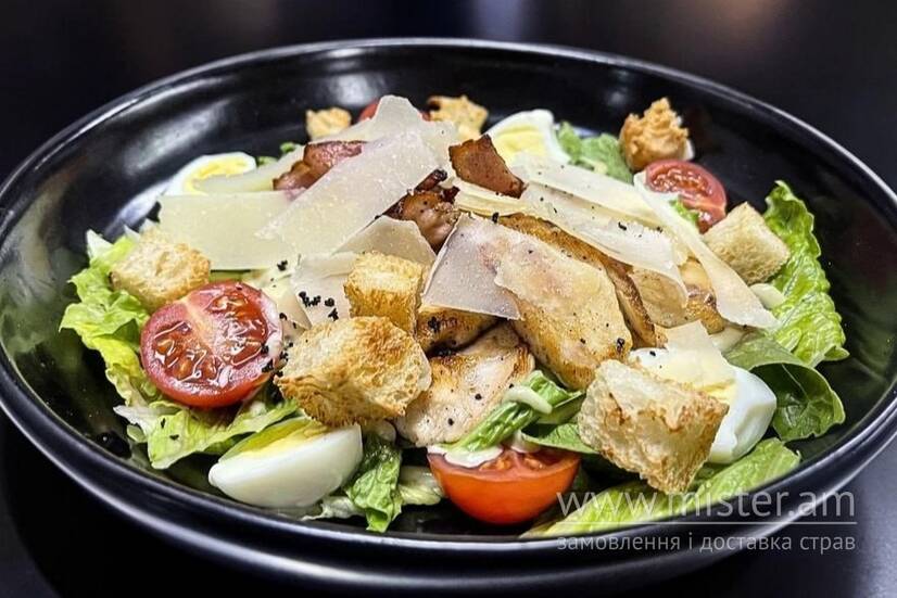 Легендарна класика, що поєднує ніжність та хрусткість в одному смаку. Соковите куряче філе су-вид, хрісткий бекон, хрустке листя салату ромен, ароматні грінки з пармезаном та фірмовий соус на основі анчоусів і пармезану.