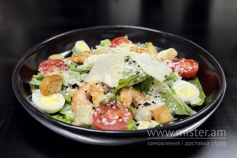 Вишукане поєднання морських нот і класичних смаків. Соковиті тигрові креветки, хрусткий бекон, ніжне листя салату ромен, ароматні грінки з пармезаном та фірмовий соус на основі анчоусів і пармезану. Легкий, витончений і водночас насичений салат для справжніх гурманів