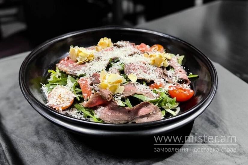 Салат з ростбіфом – вишукане поєднання ніжного м’яса та хрустких акцентів. Соковитий ростбіф, мікс салатів айсберг, рукола та шпинат, соковиті томати чері, пікантна цибуля фрі та витончений пармезан. Родзинка страви – ніжні кульки сиру Філадельфія, вкриті ароматною мигдальною стружкою, що додають кремової текстури та горіхових нот. Завершує композицію вишуканий горіховий соус, що підкреслює гармонію смаків.