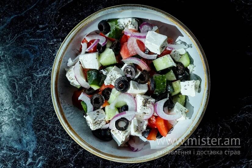 Свіжі овочі: соковитий помідор, хрусткий огірок, соковитий болгарський перець, маслини, ніжний сир фета, поливається оливковою олією.