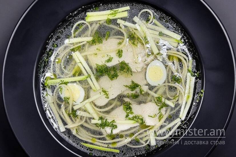 Наваристий курячий бульйон з додаванням курячого філе, цукіні, спагетті, перепелиного яйця та зеленої олії.