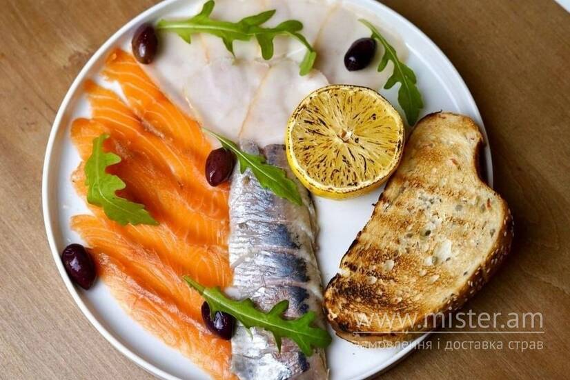 Тонко нарізаний лосось слабої солі, ніжна масляна та оселедець — ідеальне поєднання смаків для легкої закуски.