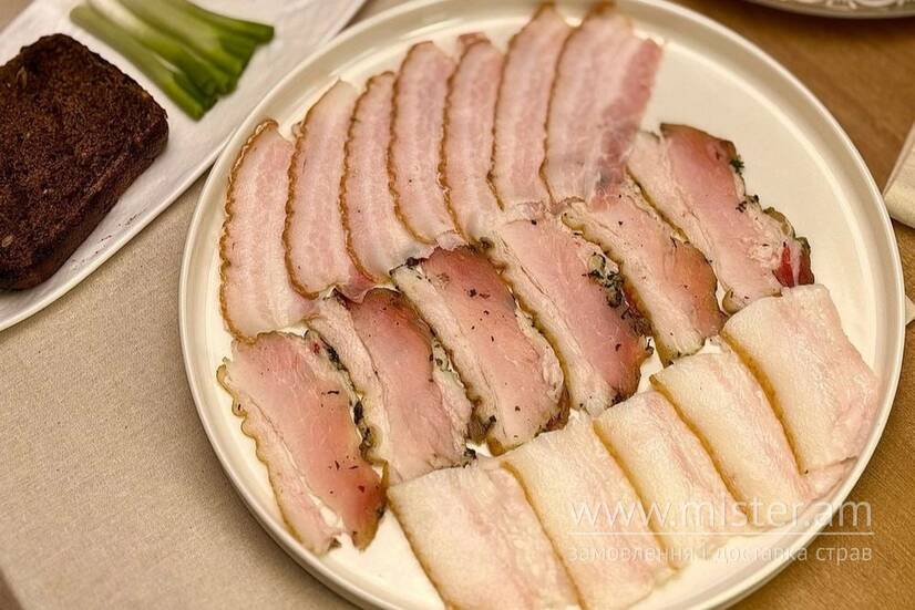 Сало копчене, сало з банки солене та підчеревок в маринаді, подається з гірчицею, чорним хлібом, зеленою цибулею.