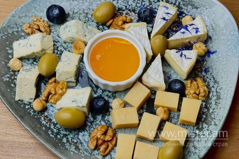 Три види сиру: дорблю, пармезан, брі з медом, оливками та ягодою.