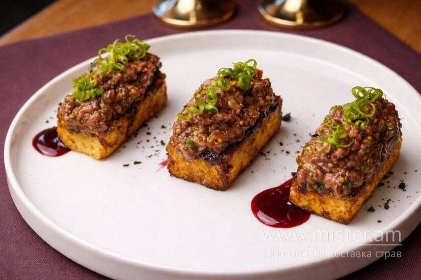 Тартар з яловичої вирізки на булочці бріош з цибулевим варенням, каперсами.
