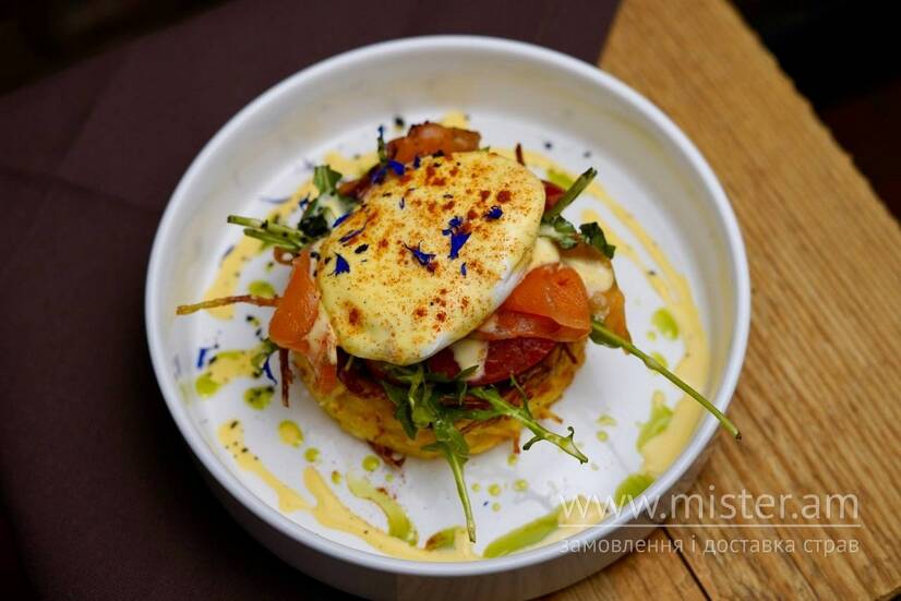 Хрусткий дерун із ніжним лососем, свіжими овочами та зеленню. Яйце, соус голландез і кремова страчатела створюють гармонійний акцент, а паприка додає яскравої пікантності.