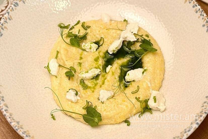 Традиційний банош з молодим сиром та додаванням зеленої олії.