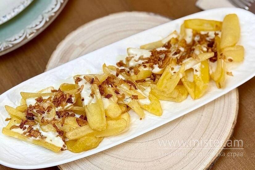 Картопляні діпи з додаванням сирного соусу на основі вершків та сиру дор блю. Прикрашаємо цибулевим кранчем.